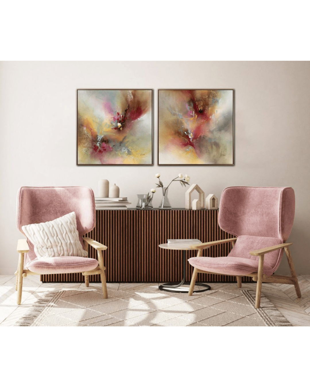 With their medium-large scale (30×30 inches each), the Fiore paintings are ideal for various settings. Whether placed in a living room above a sofa, a bedroom above a headboard, or a gallery-style hallway, they command attention without overwhelming the space.