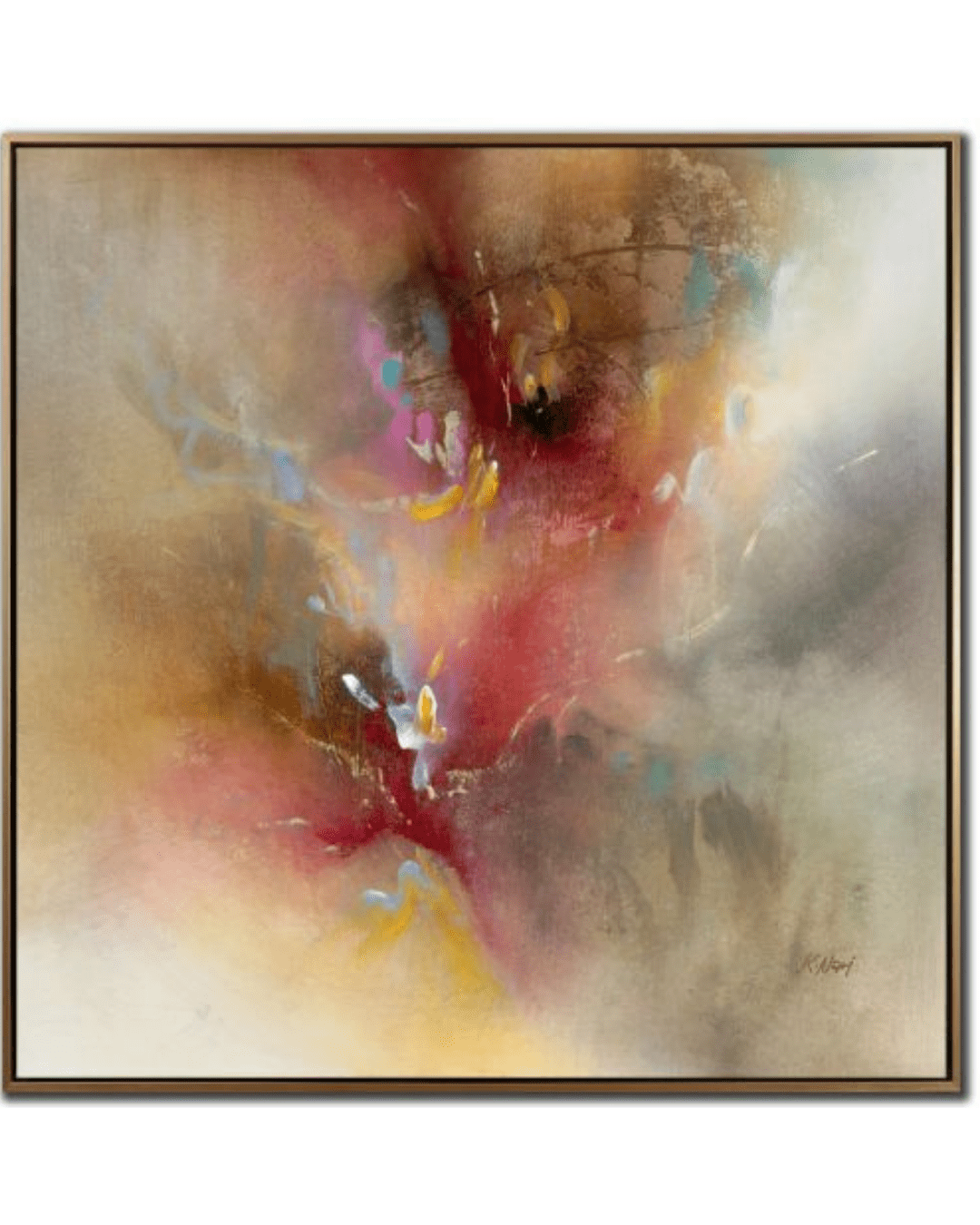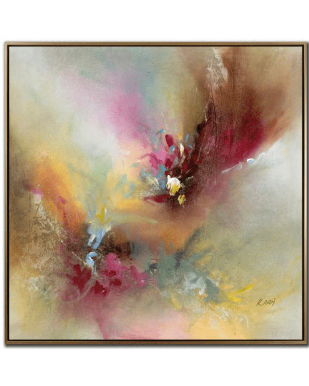 The choice of a gold floating frame complements the ethereal qualities of the paintings without overpowering them. The frame adds a touch of luxury and refinement while providing structure and definition. It reflects light subtly, echoing the luminosity within the canvas itself. The floating effect further enhances the sense that the artwork is hovering, light as air, and gently radiating outward.