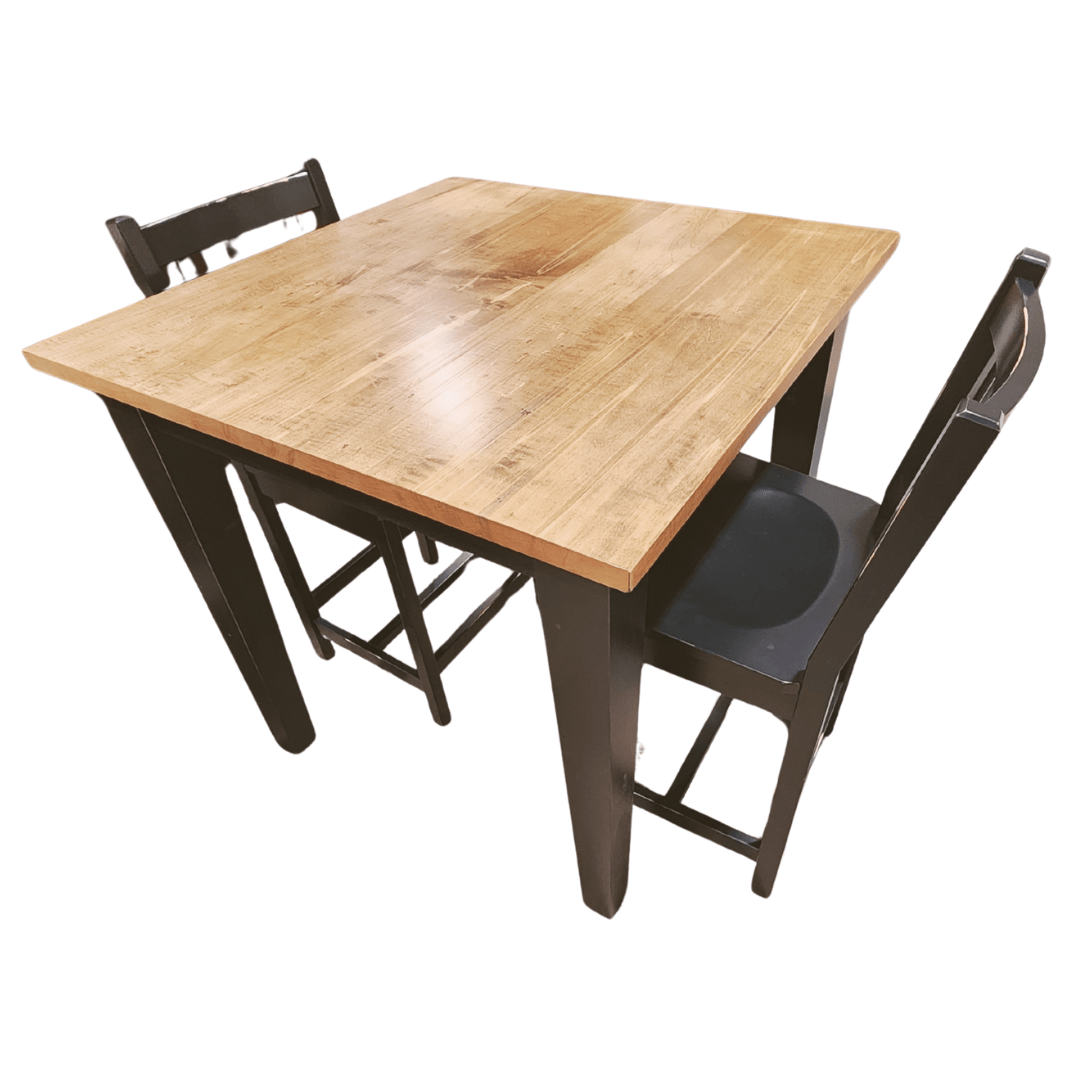 Handcrafted from wormy maple, this counter height set showcases the durability and character that only solid wood can provide. The table features a Provincial stain top, which highlights the natural beauty of the maple grain, paired with a black painted base for contrast and sophistication. The matching Shaker Bar Chairs are also finished in black with rubbed edges, revealing the warm wood beneath for a gently distressed, handcrafted look. This two-tone finish creates depth and charm, adding to the uniqueness of the set.