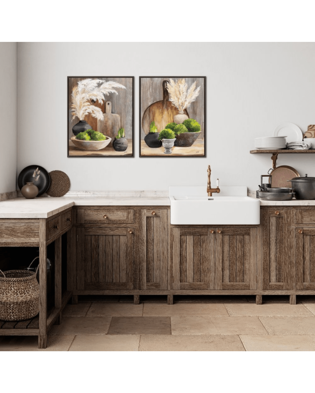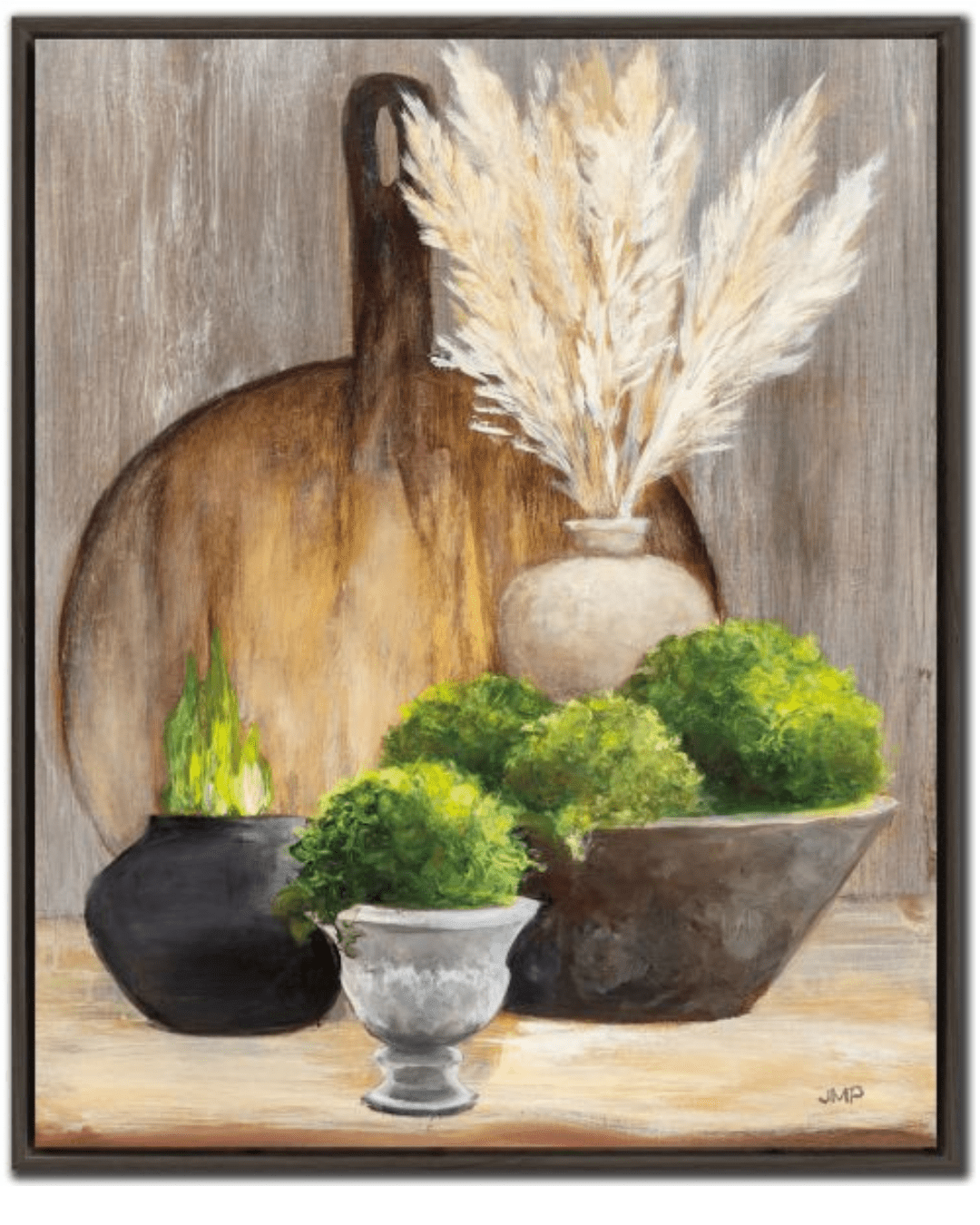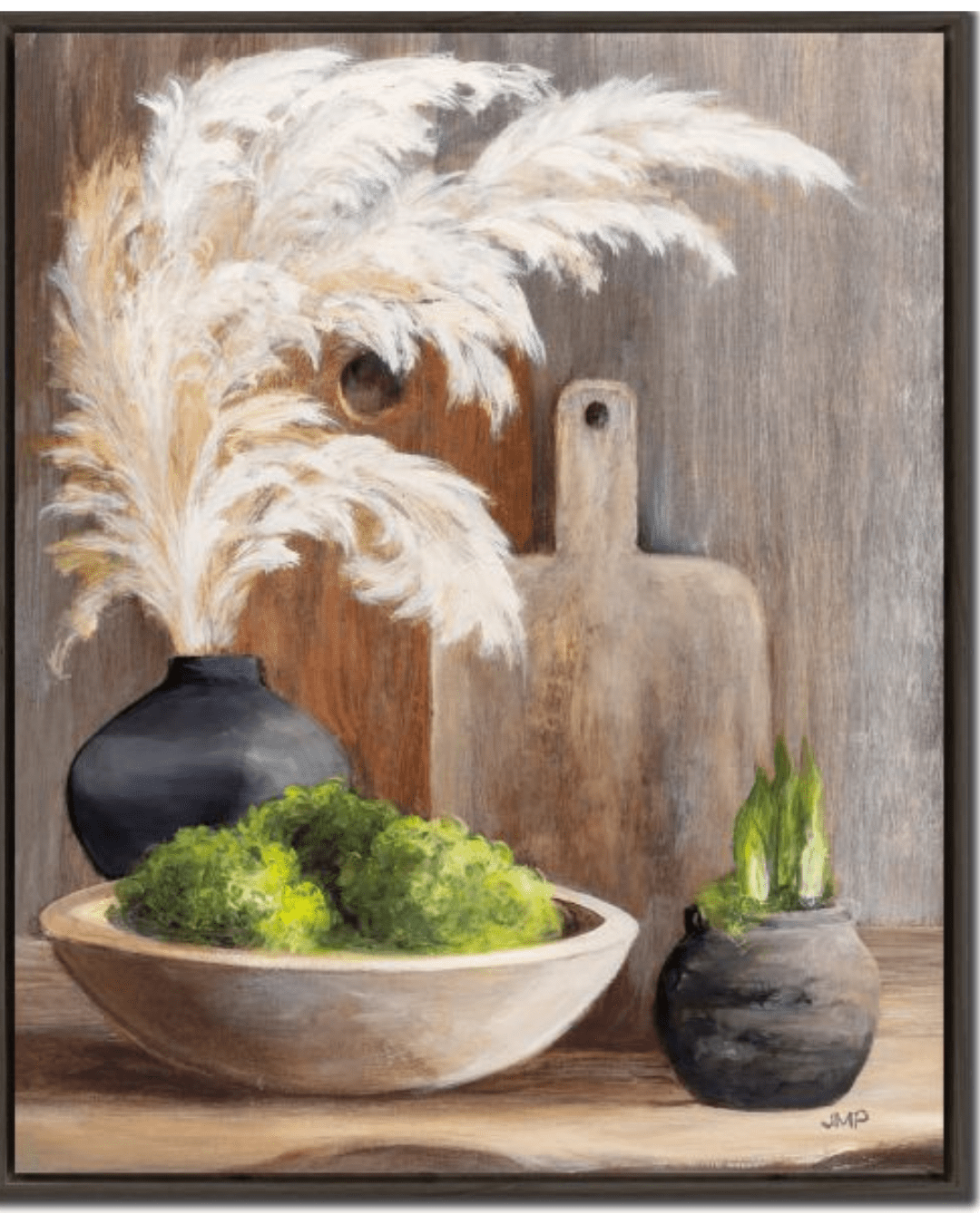 In the left panel of the set, the pampas grass springs from a matte black vase placed to the rear of the composition. It fans out gracefully across the upper half of the canvas, drawing the viewerâs eye upward. Below it sits a wide, shallow beige bowl filled with bright green moss, and beside it is a small dark jar housing vertical blades of greenery. Behind the central arrangement are two cutting boards, painted in warm wood tones, providing a rustic backdrop that adds depth and texture to the composition.